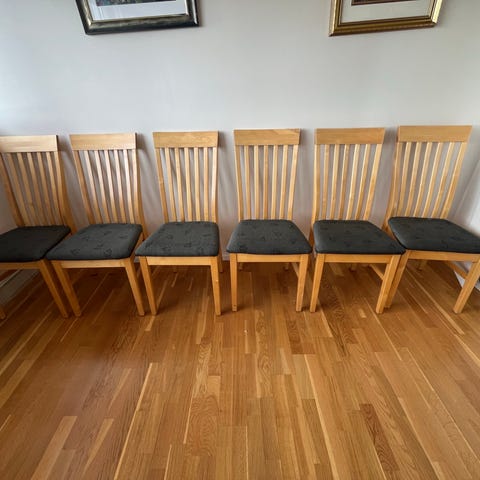 6 spisestuestoler selges rimelig. 500 kr for alle. En av stolene kan ha fordel av litt lim.