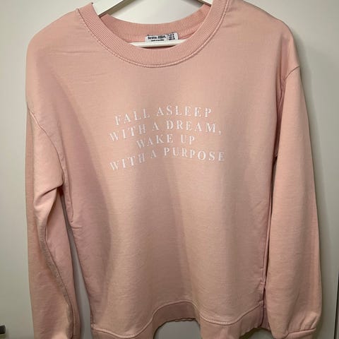Søt gul genser med kul tekst, perfekt å bruke på treningssenteret, komfortabel, kun brukt én gang. Selger den fordi størrelsen er for stor for meg.
