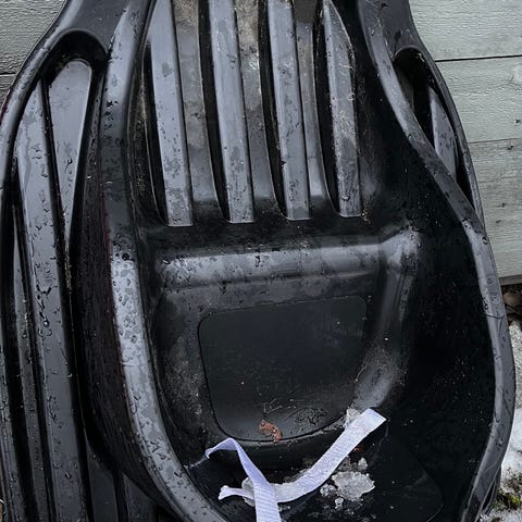 Stiga akebrett i rød plast med tau.