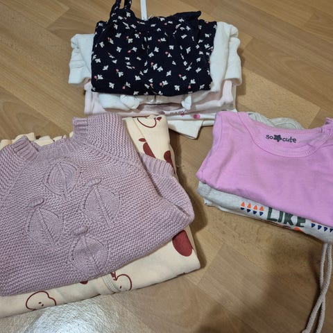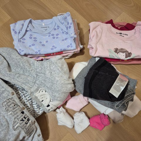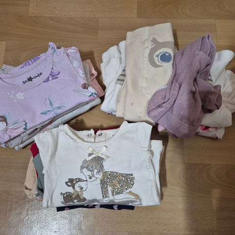 Selger fin klespakke i størrelse 62–68 cm. Inneholder ulike plagg i god brukt stand