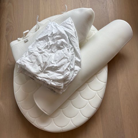 Madrassen følger med (brukt tisselaken som ekstra beskyttelse).