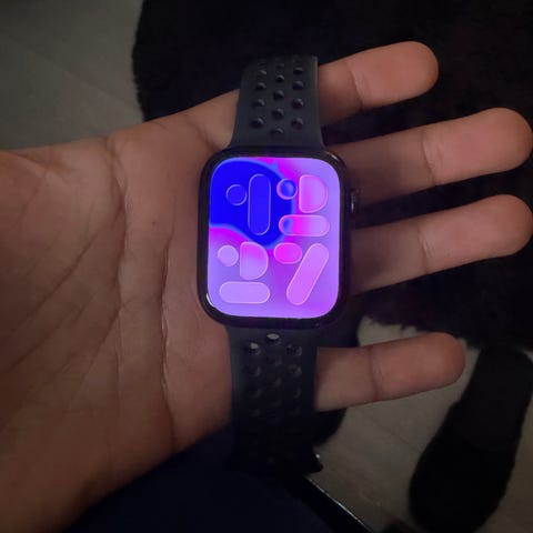 Apple Watch 7 series i blå rem. Produktet består av et armbånd og en lader til smartklokke. Klokken har ingen skader eller hairlines på glasset. Klokken er 45 mm