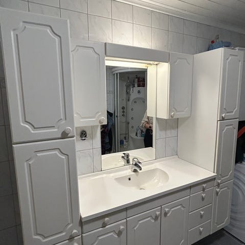 Baderomsmøbel sett hvit med servant, speil og høyskap