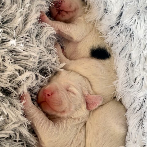Valpene ble født 17.12.2025. De vokser opp på gård og fremstår som trygge og sosiale valper for alderen.