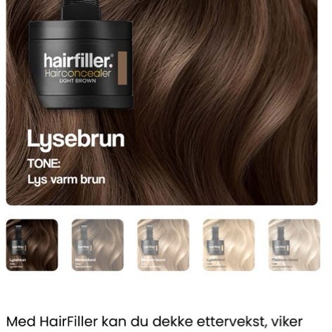 Hairfiller hårpulver i fargen Medium Blonde og Dark Blond. Produktet er designet for å fylle ut hår og gi et naturlig utseende. Leveres i original emballasje. Se mer på www.hairfiller.se Er ikke pakket opp, da jeg med et uhell bestilte dobbelt. Selges for 100,- pr stk. Ny pris er kr 249,- pr stk. Sender ikke.