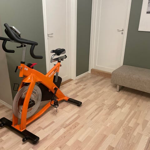 Trimsykkel med digital skjerm for visning av treningsdata og justerbart sete for tilpasset komfort. Sykkelen har pedaler med fotstropper og et rammedesign som gir stabilitet under trening.