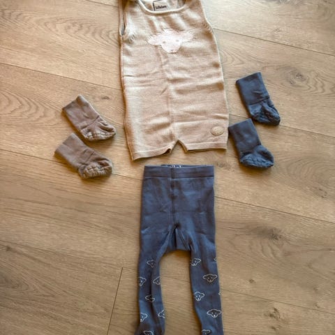 Kjempefin ullpakke med beige ulldress, brun ull lue og beige ull votter til baby, strl 62 på dressen, strl 40-42 på lue og strl 62-68 fra Lillelam. Brukt av jente.