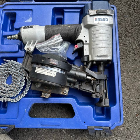 Makita spikerpistol med coilmagasin egnet for bruk med spiker i coil. Verktøyet har et robust design med metallhus og et håndtak med grep. Leveres i koffert