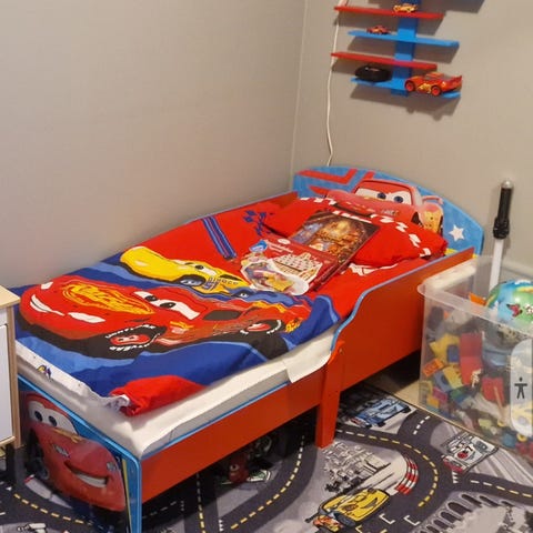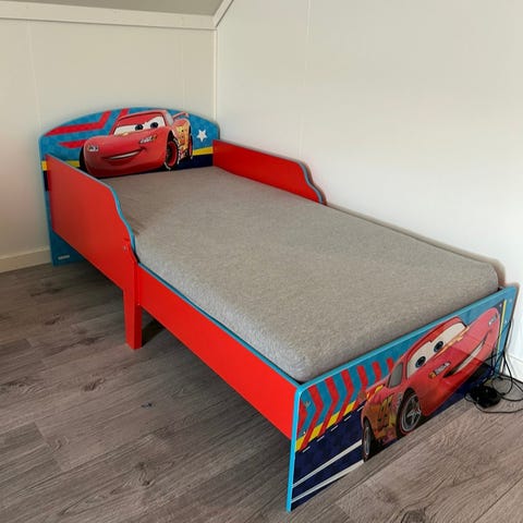 En lite brukt spiderman-seng, med skumgummi madrass til. Kjøpt ny for ca 2 år siden for 1995 kr uten madrass. Vi kjøpte ny madrass til, og den følger med nå. Følger også med to røde tøy bokser som får plass under sengen.
