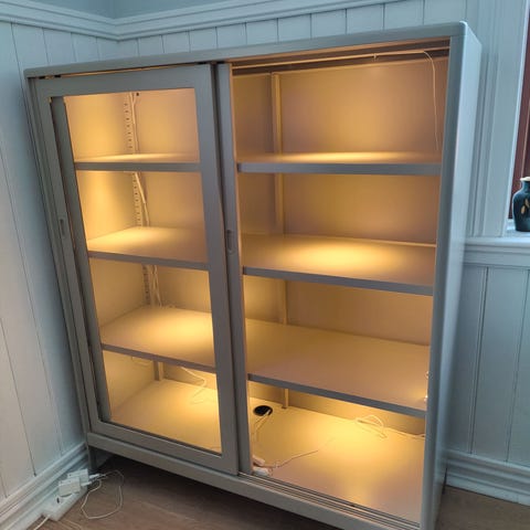 Enkelt og fint vitrineskap med innvendig belysning på én hylle, glasshyller, skuffer og skyvedør (touch) på sidene. Fint møbel til pynt som lyser opp glass og servise.