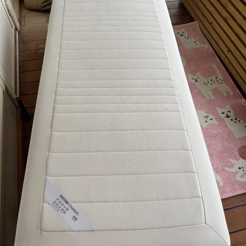 IKEA sammenleggbar seng med ramme i metall og lameller i tre. Sengen har et enkelt og funksjonelt design, egnet for gjesterom eller midlertidig bruk. Fargen på rammen er hvit, og sengen kan foldes sammen for enkel oppbevaring.