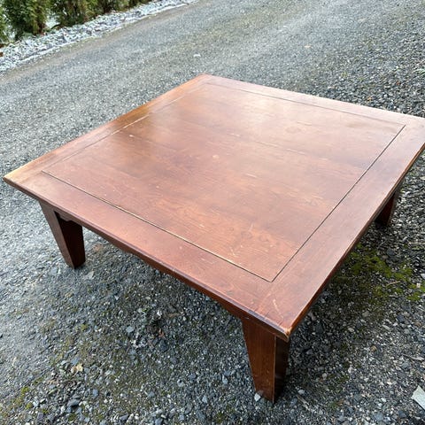 Pent salongbord med morsom asymmetrisk bordplate i lyst tre, kjøpt på Skeidar. Bordet har stått i en kjellerstue og er lite brukt.