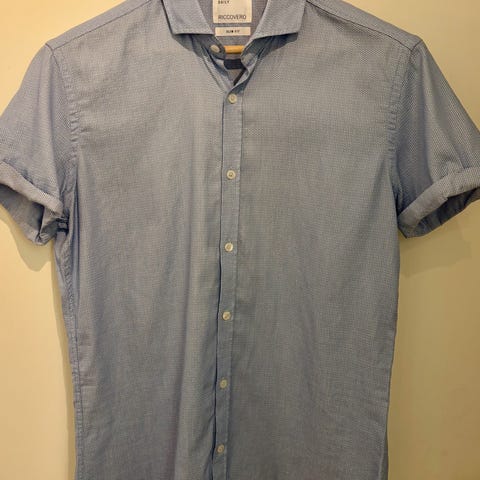 Riccovero-skjorte i størrelse M, laget av bomull. Skjorten har et rutemønster i gråtoner og langermet design. Selges ettersom den brukes lite.