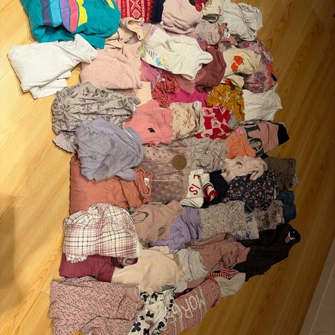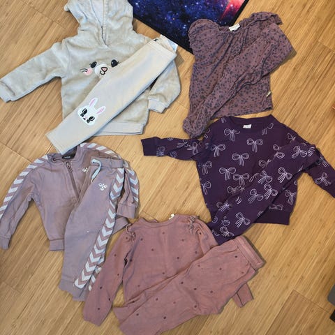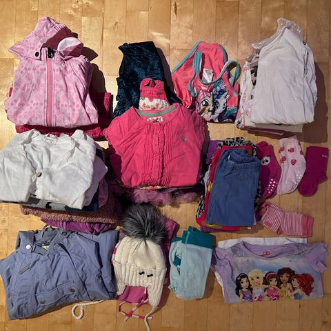 Mange bukser, gensere, T-skjorter, en regn dress, en tynn ikke vanntett dress, jakke.
