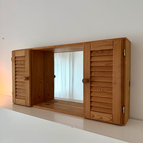 Fin lakkert furu seksjon med to skuffer og åpne hyller.
