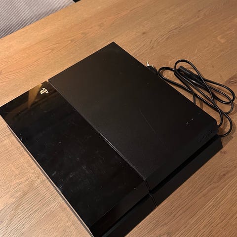 Sony Playstation 4 spillkonsoll med to trådløse kontrollere i svart og rødt. Konsollen har standard størrelse og design for Playstation 4-serien. Kontrollene er utstyrt med touchpad og analoge spaker. Leveres med strømkabel.