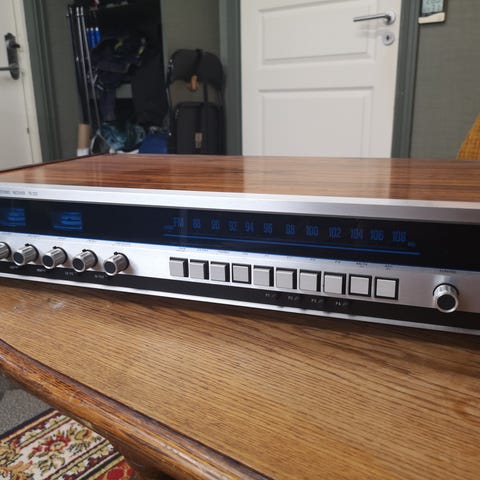 Apparatet virker som det skal, inkl. den innebygde kassettspilleren. Potmetre er renset, og fronten og kjøleristen er rengjort.