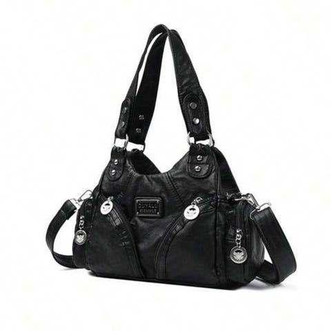 Mørk grå veske i skinn fra Lucky i New York selges grunnet lite bruk. Den har lang skulderrem og er romslig. Mål: 33x30x8cm