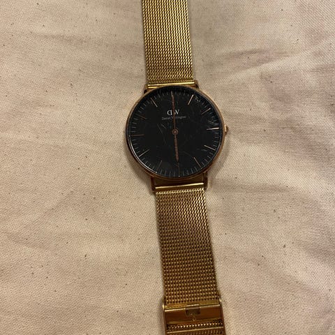 Selges da den ikke brukes lenger og blir liggende i smykkeskrinet. Må bytte batteri da den har stoppet. Har tatt av noen lenker som følger med, dette kan settes på igjen samtidig som batteri skifte😊 dette er ikke så dyrt!