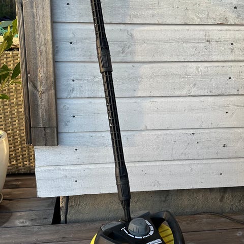 Kärcher høytrykksvasker i gul og svart farge. Utstyrt med slange og lanse for rengjøring. Egnet for utendørs vask og rengjøringsoppgaver.