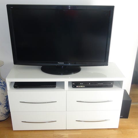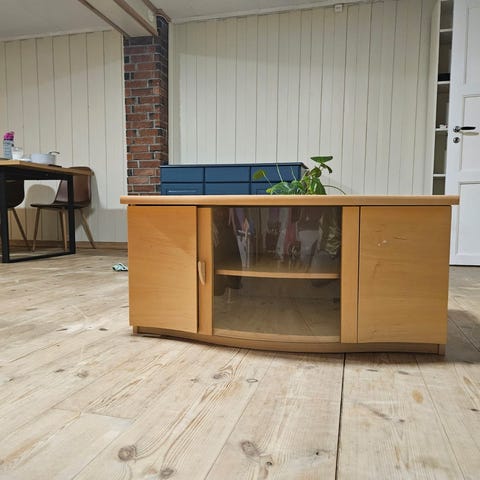 Pent brukt TV benk / Salongbord i glass gis bort for passer ikke mer på stue. Benken er med svingbare hjul.