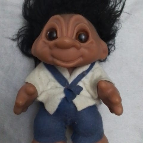 Ekte original lykketroll som er arvet fra mellom 1960-1970 tallet. Merket med Made in Denmark på ryggen. 14 cm lang og høy etterspurt størrelse. Lykketrollet har svart hår med en oransje sløyfe i håret med hvit perle hjerte. Den er pent behandlet og lite brukt med ingen skader/merker.