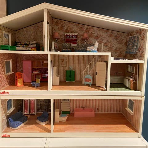 Eldre Lundby dukkehus med innredning. Mange fine detaljer som platespiller, kjøkkenutstyr og baderomsinnredning. Siden det er av eldre dato er noen av delene tørre. Pappafiguren er limt og kan derfor ikke sitte. Kjøleskapet mangler dør. Uten lys.