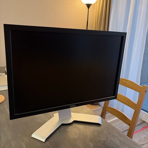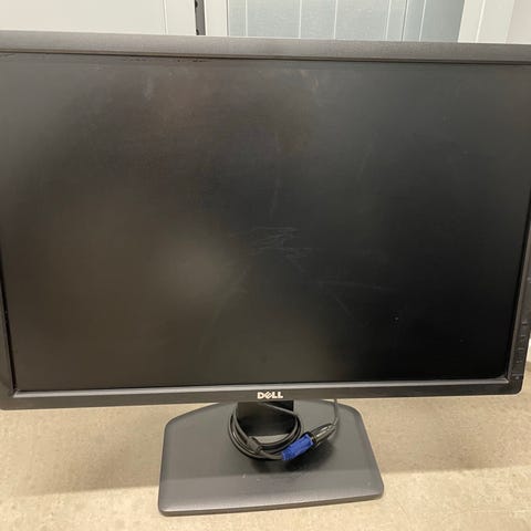 Har noen slipe merker på foten men ingen problem så langt med monitoren, selges med strøm kabel og display port kabel (display port kabelen er litt slitt)