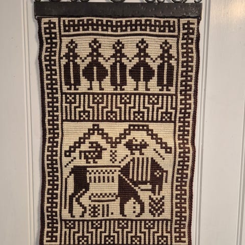 Mål med frynser og oppheng, oppheng er sydd på og følger med.