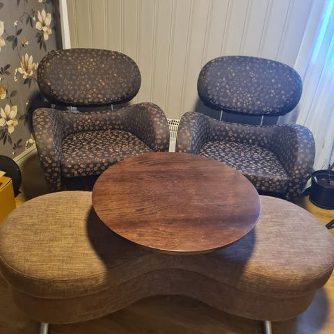 Svinges. Fra Møbelringen. Norske møbler fra Brunsta.Noe bruksmerker på bord,men ikke sjenerende. Litt slitt på sitte pute og pall. Se bilder.