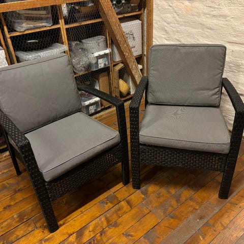 OBS: På den ene stolen er overflaten skadet, da en voksen person stod på stolen.