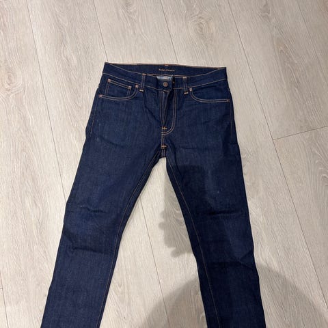 Nudie Jeans, modell Lean Dean, farge Blue Delusion, størrelse W31 L32. Jeg har en eldre Nudie bukse i denne størrelsen og antok at disse passet så jeg kastet lappen, men de er dessverre for store for meg og jeg fikk ikke returnert/byttet dem :( nypris 1800 kroner