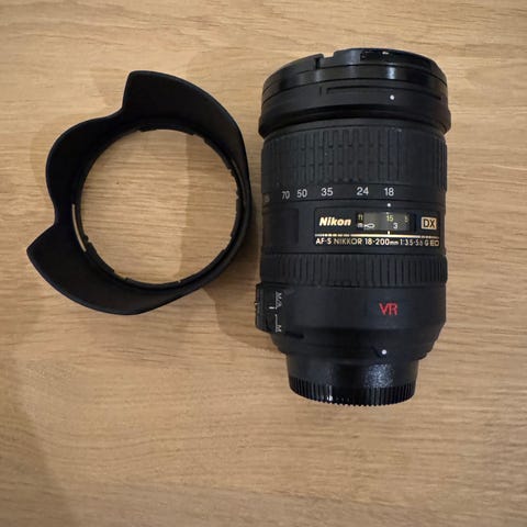 Nikon AF-S DX Nikkor 18-55mm f/3.5-5.6G VR II objektiv med variabel brennvidde 18-55mm og blenderåpning f/3.5-5.6. Objektivet har vibrasjonsreduksjon (VR) og er designet for Nikon DX-format kameraer.