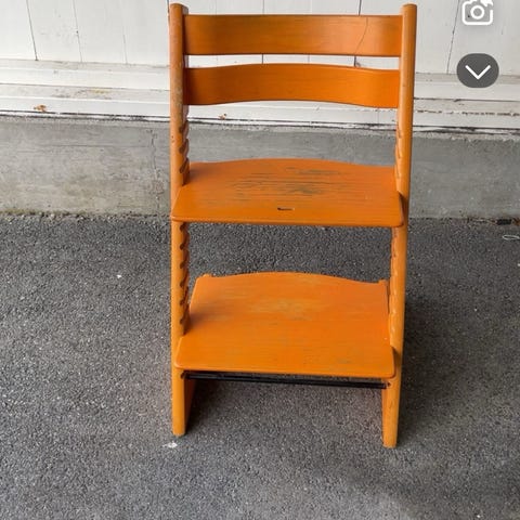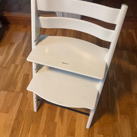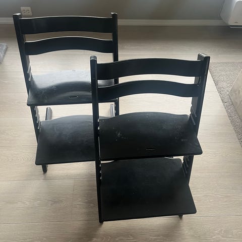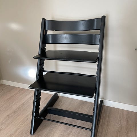Stokke TrippTrapp barnestol i svart. ‘’Gammel type’’. Barnestolen har justerbare setehøyder og fotstøtte, laget i tremateriale. Designet for barn og gir støtte og komfort ved spisebordet. Stolen har blitt lakkert sort i senere tid.
