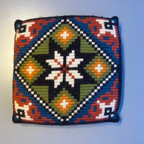 Håndlaget brodert pute med fargerikt mønster på forsiden og ensfarget bakside.