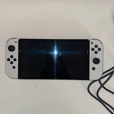 Nintendo Switch OLED konsoll med OLED-skjerm. Konsollen er designet for spill på Nintendo Switch-plattformen.
