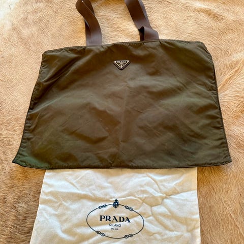 Nylonveske fra Prada. Den ble limt i ene hjørnet fordi den var slitt, er ellers fin.