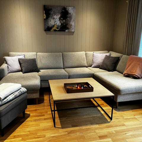 Selger en stor og komfortabel hjørnesofa i god stand. Sofaen er pent brukt, uten flekker eller skader, og veldig behagelig å sitte og ligge på.