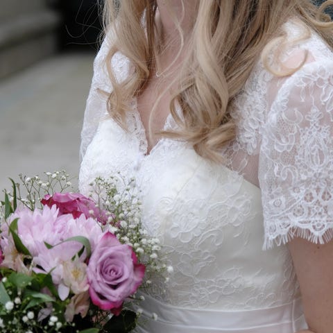 Brudekjole i hvit farge, størrelse L. Kjolen har lange ermer med blonder og en skjørtdel i tyll. Ubrukt med lapp.
