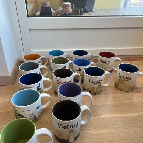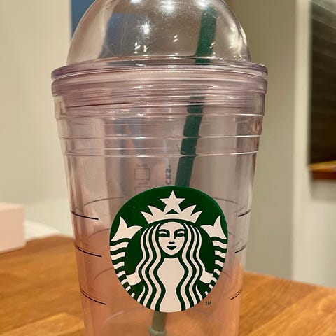 Fem ubrukte gjenbrukbare kopper med lokk og sugerør fra Starbucks. Størrelse er ca 700ml.