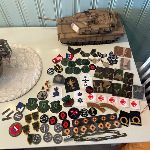 Forskjellige militære merker og patches inkludert NATO-OTAN, U.S. Army, ISAF, Hæren, Kystvakten og andre merker og distingsjoner. Patchesene varierer i farger og design, og er laget av tekstilmateriale. Kan brukes til samling, dekorasjon osv.