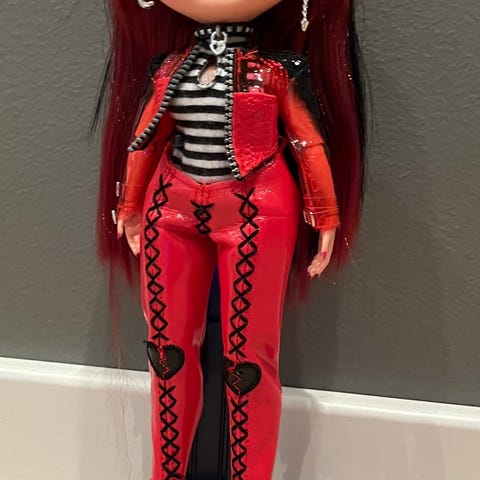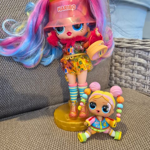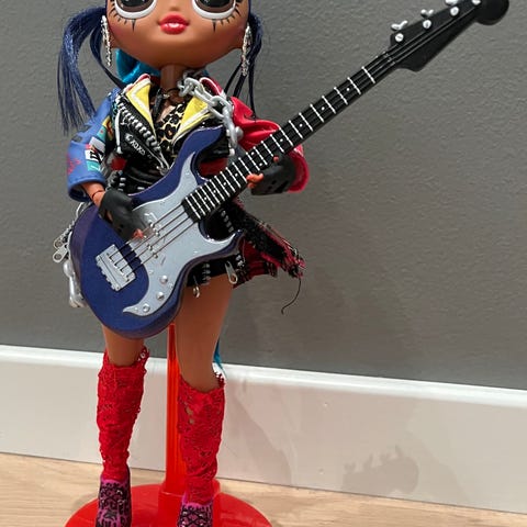 L.O.L. Surprise dukke med langt blått hår, iført fargerikt og mønstret antrekk, inkludert rød støvler og ulike tilbehør. Dukken står på en rød base og passer for lek og samling.