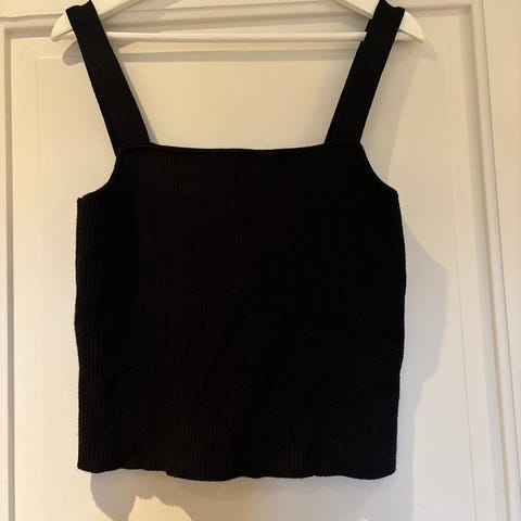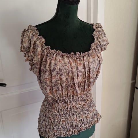 Topp med kort pufferm og mønster, krepp i stoffet. Bomull overmateriale, viscose i foret. Flatterende peplum-snitt med snøring i livet.