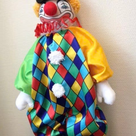 Tre små klovner som sitter på hver sin huske og et klovneansikt m veggoppheng