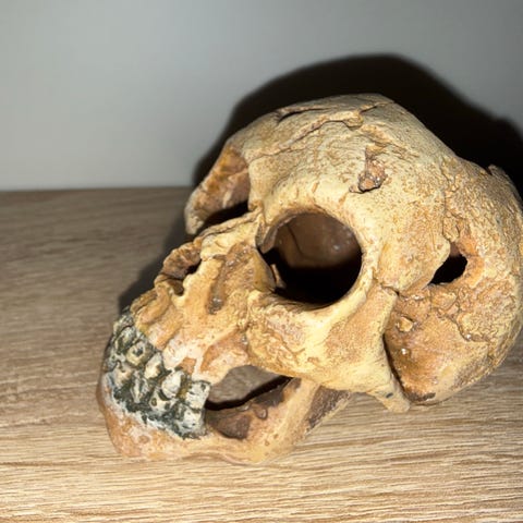 Ukjent antikk hodeformet beholder laget av metall med dekorative detaljer og patina. Beholderen har et hengsel og en åpning, og viser utsmykkinger som kan indikere kulturell eller historisk betydning. Passer til samling eller dekorasjon.