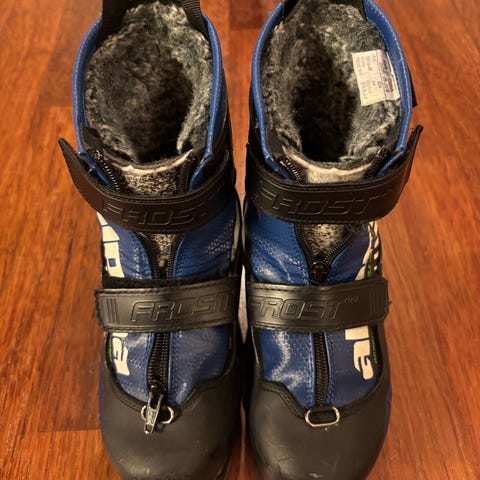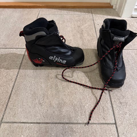 Barn st 32: Alpina skisko i blå og grå farge. Skiskoene har snøring og glidelås.