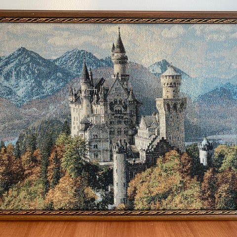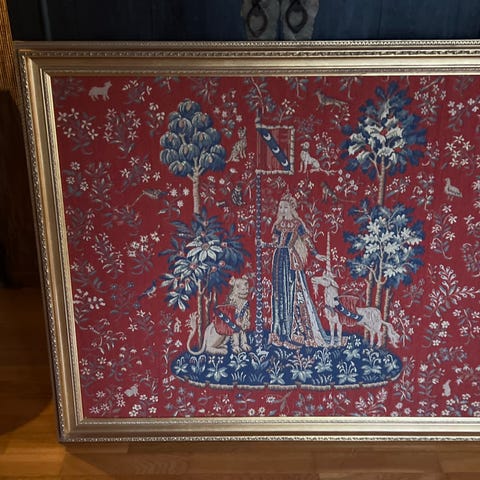 To gobeleng ulike motiver, jakt og romantikk, pris oppgitt pr stykk. Vet ikke så mye om disse, vært i familien. Ca 125x97 cm.
