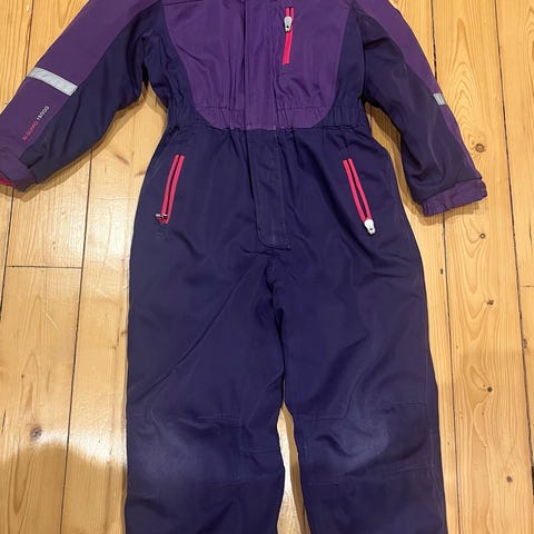Litt slitasje på det ene kneet og noen små flekker nederst på benet, ellers helt fin. Knapper for å sette inn strikk til foten om ønskelig, men strikk mangler nå. Avtagbar hette og refleks. Kjøpt i Danmark.