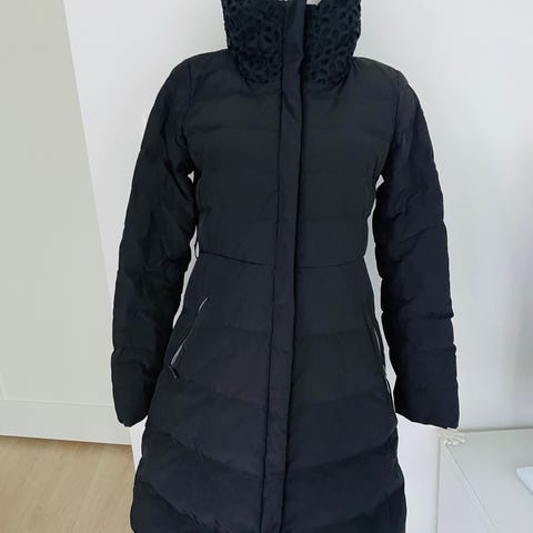 Jacket laget med resirkulert ytterside og fylt med resirkulert dun. Jakken er designet med snøring i midjen, slik at du kan tilpasse og justere passformen. Den har glidelåser i sidene.