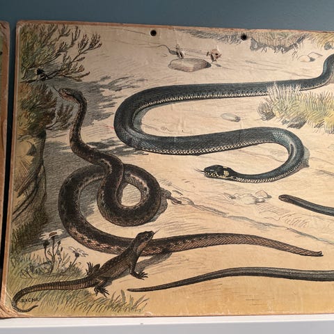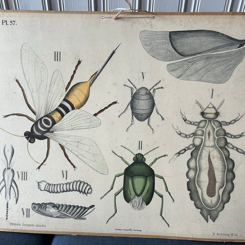 Vintage skoleplakat med detaljerte illustrasjoner av forskjellige insekter, inkludert øyenstikker, gresshopper og sommerfugl. Plakaten viser insektenes ulike utviklingsstadier og anatomiske detaljer.